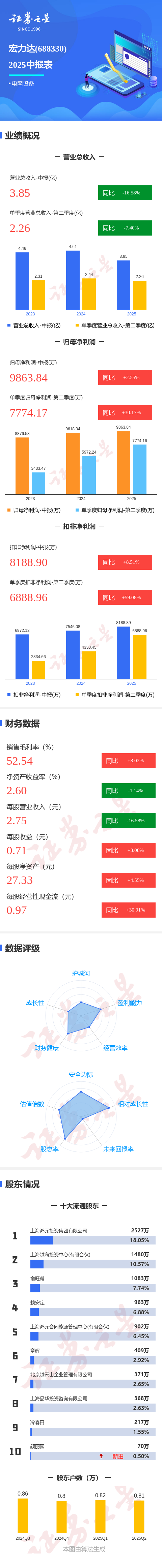 证券之星消息,宏力达2025年中报显示,公司主营收入3.85亿元,同比下降16.58%;归母净利润9863.84万元,同比上升2.56%;扣非净利润8188.9万元,同比上升8.52%;其中2025年第二季度,公司单季度主营收入2.26亿元,同比下降7.4%;单季度归母净利润7774.17万元,同比上升30.17%;单季度扣非净利润6888.96万元,同比上升59.08%;负债率8.08%,投资收益2010.97万元,财务费用-70.61万元,毛利率52.54%。